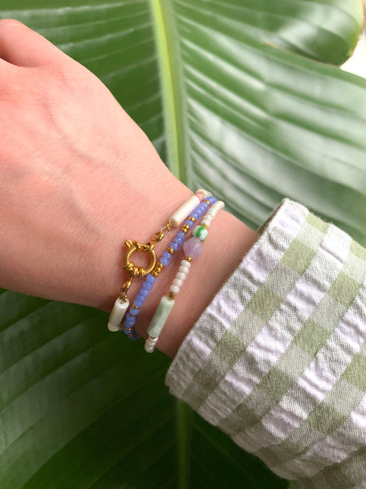 Wij maken bij onze armbanden gebruik van verschillende materialen om zo de leukste combinaties te creëren. Zo hebben wij armbanden met parels, schelp armbanden welke super leuk zijn in de zomer, armbanden met natuursteen, glaskralen, edelstenen armbanden, armbandjes met koraal en nog veel meer! De parel armband is super populair een heel makkelijk te mixen en te matchen bij andere armbandjes. Parels zijn niet meer weg te denken uit de sieradenwereld en zijn helemaal hot & happening. Ook is de parel armband bijna overal mee te combineren door de neutrale kleur. Parels geven een chique uitstraling aan iedere outfit. Parel armband zijn ook altijd goed te combineren met een schakelarmband goud. Een bedelarmband goud met parels geeft een speels effect, maar tegelijkertijd een classy touch. Combineer dit met een fijne schakelarmband of een minimalistische kralen armband en jij bent helemaal ready to go! Je kunt ook een leuke armbanden combineren bij je horloge. Zo hebben we fijne minimalistische kralen armbandjes of schakelarmbanden om net wat extra’s toe te voegen naast je horloge.