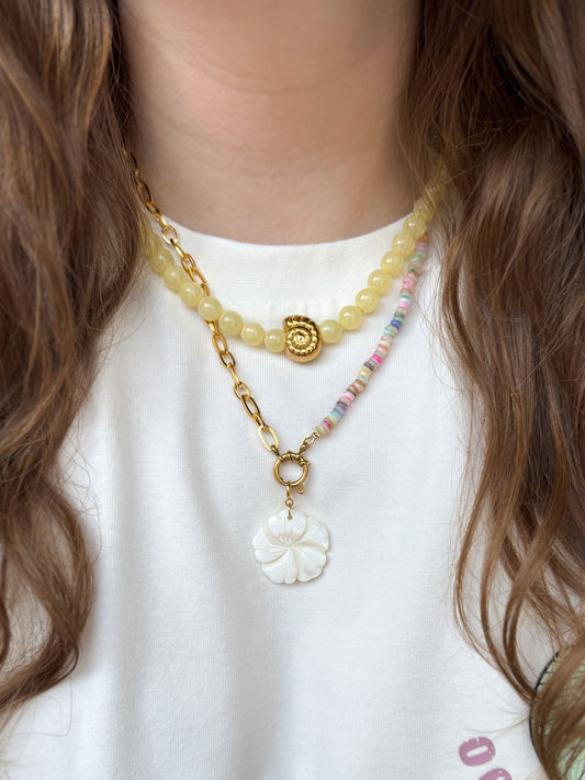 Gele kralenketting met gouden schelp
